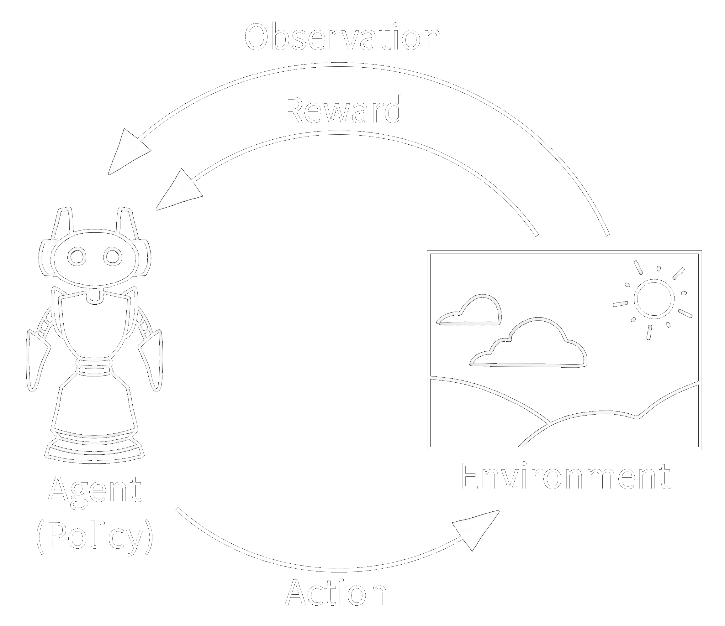 강화 학습에서 아래에 그려진 고전적인 “에이전트-환경 루프”는 에이전트와 환경이 서로 어떻게 상호작용하는지에 대한 단순화된 표현입니다. 에이전트는 환경에 대한 관찰을 받고, 에이전트는 행동을 선택하며, 환경은 이를 사용하여 보상과 다음 관찰을 결정합니다. 이 주기는 환경이 끝날(종료될) 때까지 반복됩니다.